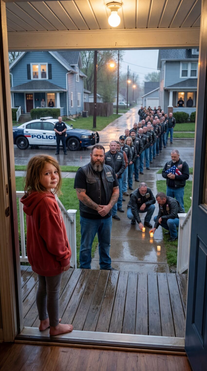By 7:25 p.m., the narrow residential street held nearly thirty motorcycles, lined with deliberate care along both sides of the pavement. Their headlights were off. Their chrome dulled under the rain.