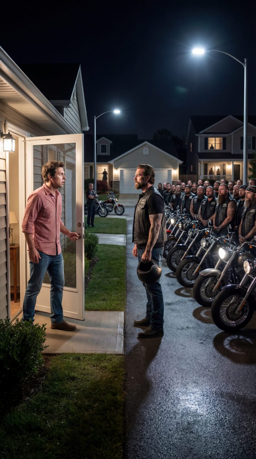 They poured into the street, headlights cutting through the dark, engines rumbling in a slow, controlled wave until they came to a stop directly in front of his house.
