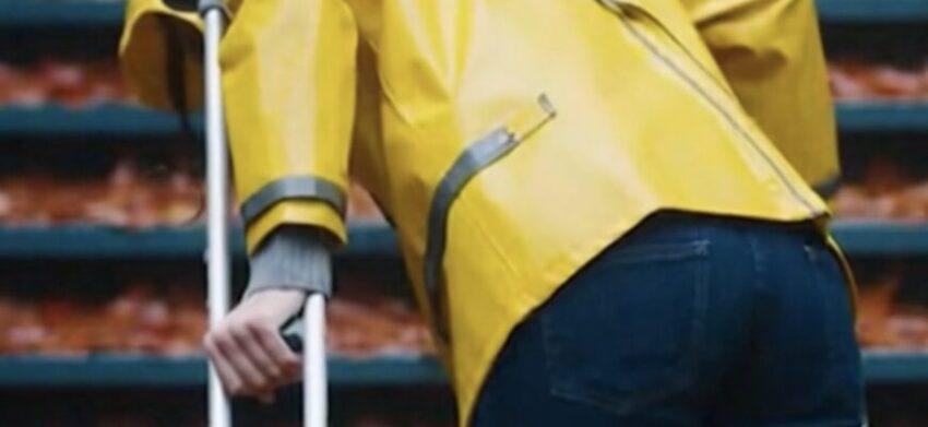 It starts with the rain and a stark visual contrast. A young woman, clad in a bright, unmistakable yellow raincoat, stands at the bottom of a long, leaf-strewn wooden staircase. She is injured, balancing on crutches with her left leg encased in a heavy white cast.
