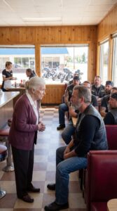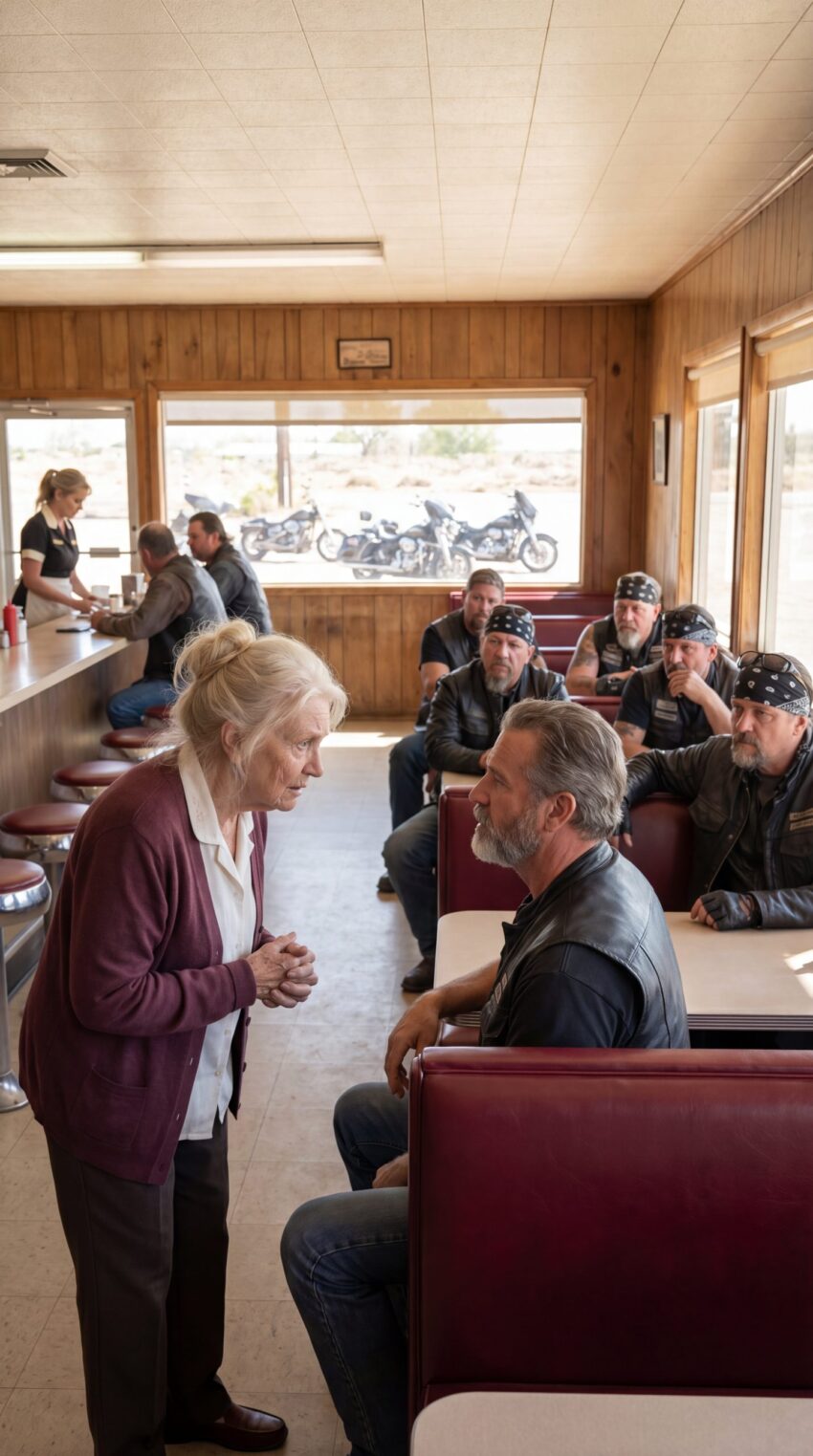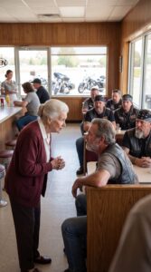 Her shoes made light tapping sounds across the tile as she walked toward the bikers’ booth. The waitress behind the counter paused with a stack of clean glasses in her hands. A man halfway through paying his bill stopped counting his cash. Even the laughter at the biker table faded as Eleanor came closer.