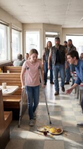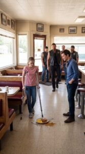 Her wheelchair was carefully positioned beside the booth, angled just right, as if she had done it so many times it had become second nature. Every movement she made was controlled, deliberate, almost cautious—like she had learned early on that taking up less space made things easier for everyone else.