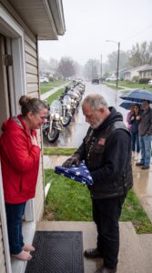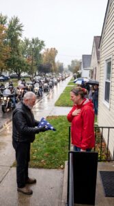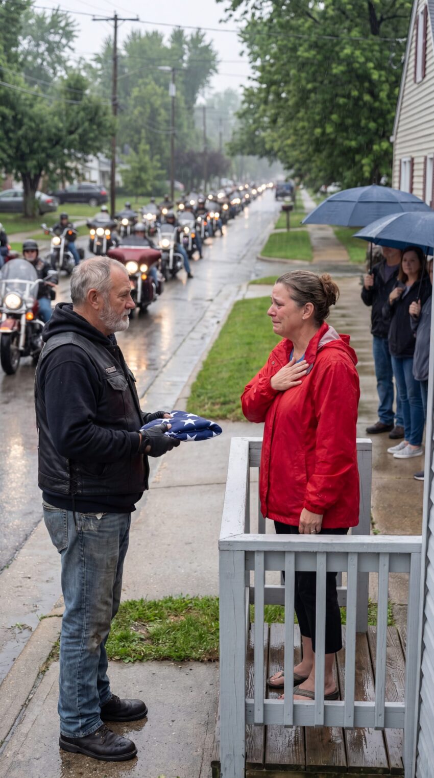 The riders stood in formation, facing one small house with faded blue siding and a porch light that had been left on too long. Rain soaked into their leather vests, ran down their sleeves, and gathered at their boots. Some held their helmets. Others let them hang at their sides.