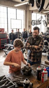 Without saying anything else, Lucas stood and walked toward the far corner of the workshop. He dragged out an old push mower—rusted, uneven, one wheel bent out of place.