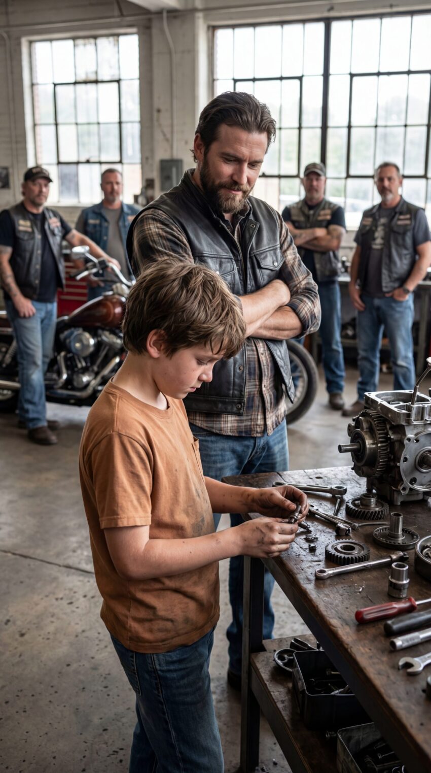 Most people who passed by the building either ignored it or avoided looking at it for too long. It wasn’t the kind of place where children usually waited alone. The faded brick wall carried a bold emblem—Iron Ravens Motorcycle Association—and from inside came the deep, steady rumble of engines, like distant thunder rolling across the ground.
