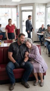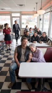 The rain hit the windows of the roadside diner in Carson Valley like a restless hand that refused to stop knocking. Neon light flickered faintly against the glass, casting soft pink reflections across chipped tabletops and half-finished meals.