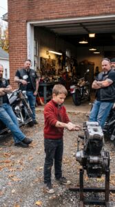 Inside the yard, engines rumbled and tools clanged against metal tables. The sound of motorcycles echoed like distant thunder. It was the kind of place that usually made adults hesitate before walking in.