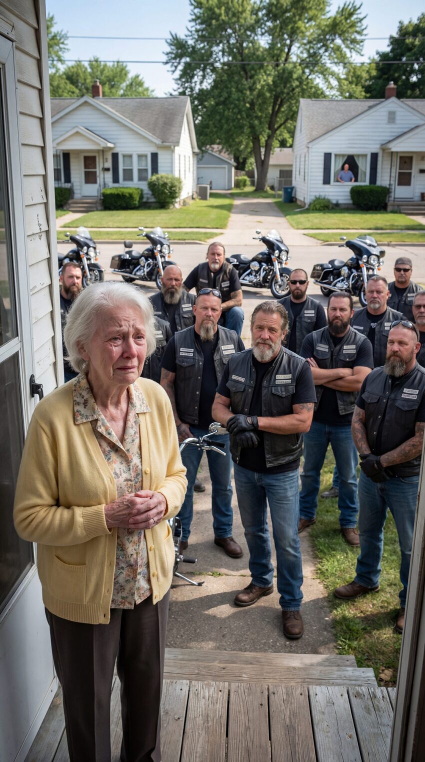 It rolled through the neighborhood like distant thunder, low and steady, vibrating through the cracked pavement and up into the fragile wooden porch where a 77-year-old woman stood waiting. It wasn’t a storm. It was something more deliberate, more controlled—engines moving together with purpose.