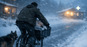 The ride to the clinic was eight miles of winding roads, frozen potholes, and near-zero visibility. The snow whipped sideways, slapping David’s face with every rotation of the wheels. His breath came out in heavy bursts, each cloud immediately caught by the wind and shattered. His gloved hands gripped the handlebars so tightly they went numb within minutes.