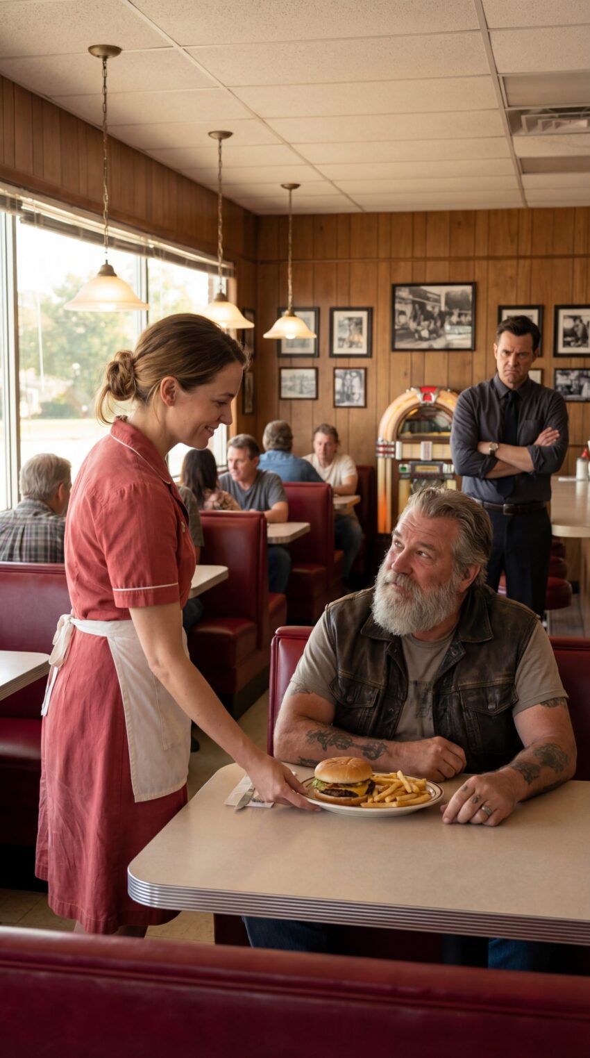 Rain pressed hard against the windows of a quiet roadside diner on the outskirts of Cedar Falls, Iowa. The kind of rain that made the world feel smaller, like everything outside had been washed away except this one glowing place.