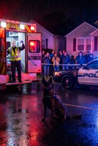 Up until that point, he had been restless but cooperative, pacing, whining softly, pressing his nose to the edge of the stretcher as if memorizing the scent. But as the rear doors began to swing inward, as the metal frame of the ambulance prepared to close around Leonard and pull away, Kael stepped directly behind the vehicle and planted himself in the narrow strip of asphalt between the bumper and the street.