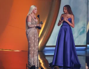 lue Ivy sparkled in a satin maxi.