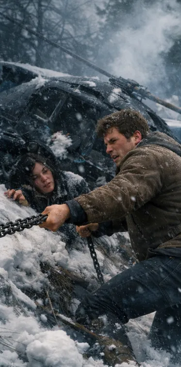 He scrambled back up the slope, slipping twice before reaching the truck. His hands shook as he looped the chain around the hitch, then dragged the other end back down through the snow.