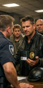 He set his helmet down on the counter with a heavy thud that echoed through the room. Then he lifted his eyes and met the officer’s glare without the slightest hint of hesitation.