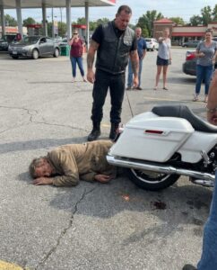 The homeless man suddenly threw himself down in front of a biker’s rear wheel just as the engine roared to life, and for a split second, it looked like he was trying to cause trouble.