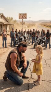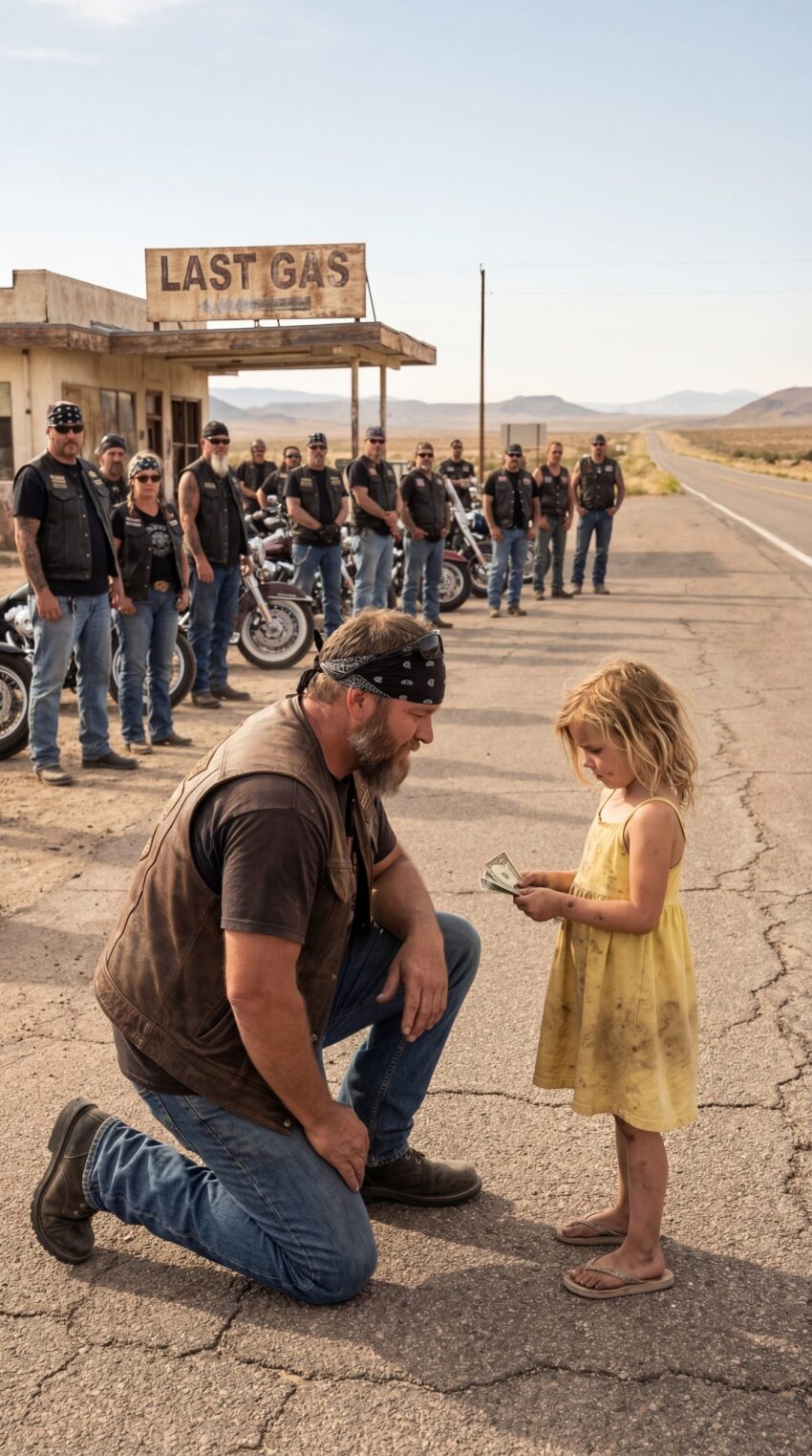 A Five-Year-Old Girl Who Had Been Surviving Alone for Eleven Days Walked Up to a Weathered Biker Holding Just $93, Begging Him to Help Bring Her Mom Home — Until the Quiet Desert Highway Suddenly Began Filling With Hundreds of Motorcycles No One in Town Expected