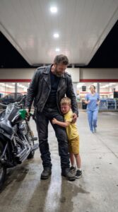 A Tired Biker Stopping at a Quiet Gas Station in the Middle of the Night Planned to Leave Without Looking Back — Until a Little Boy Ran Toward Him Calling Him “Dad” and Clung to Him Like He Was His Only Hope, Unaware That a Hidden Truth Was About to Surface