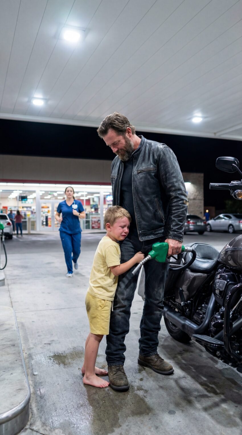 A Tired Biker Stopping at a Quiet Gas Station in the Middle of the Night Planned to Leave Without Looking Back — Until a Little Boy Ran Toward Him Calling Him “Dad” and Clung to Him Like He Was His Only Hope, Unaware That a Hidden Truth Was About to Surface