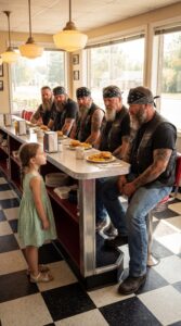 The diner’s front door opened, and cold night air rushed in as the group moved outside. Engines turned over one by one until the parking lot filled with the deep thunder of motorcycles. To the people inside, it must have looked like something out of an old story—six towering men in leather, gathering around one frightened little girl as if she were the most important person in the world.