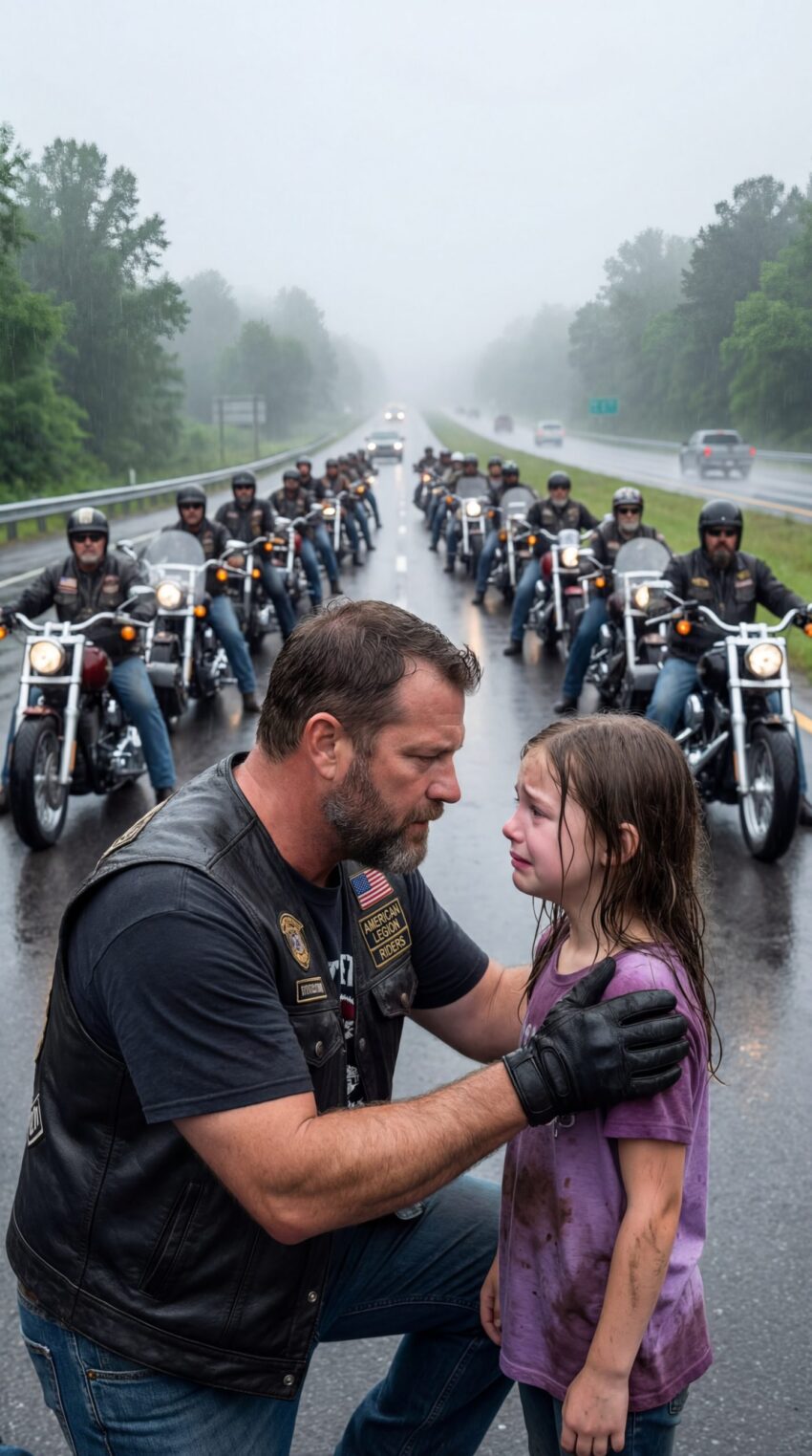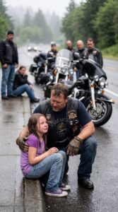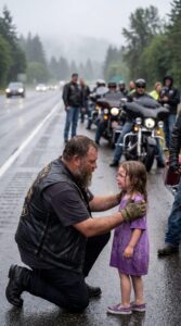The man who stepped off the front bike was huge, broad-shouldered and weathered, with a dark leather vest over a faded thermal shirt and the kind of face that looked carved from old wood. He lowered himself to one knee so he would not tower over her. Water ran from the ends of his beard, but his eyes were steady and careful.