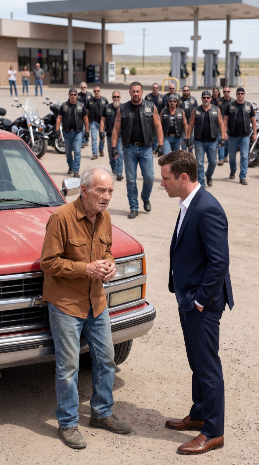 A Well-Dressed Man Tried to Force a Trembling Elder Away From a Gas Pump While Everyone Watched in Silence — But When a Group of Bikers Arrived and One of Them Stepped Forward Saying “That’s My Father,” the Entire Scene Shifted Instantly