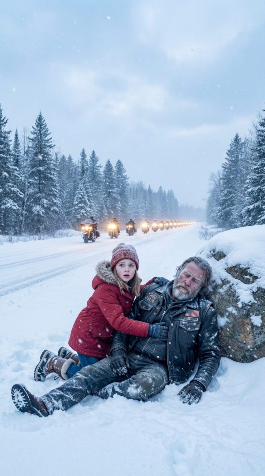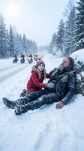At first she thought it was debris. Maybe a broken fence post or a fallen sign. But as she moved closer, her stomach tightened. It was a man. Huge, still, half-covered in drifted snow. A motorcycle lay tipped on its side several feet away, almost buried, its dark metal frosted over.