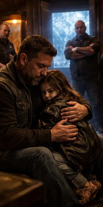 I pulled open my leather cut, unzipping the hoodie underneath and stripping down to my thermal shirt in the brutal cold. Then I wrapped the heavy jacket around her tiny frame. The leather swallowed her completely, the smell of gasoline and road dust clinging to it like armor.