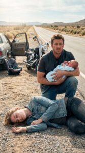 A truck passed in the far lane without noticing them. Heat pulsed off the highway. Somewhere in the distance, a bird cried out and vanished into the open sky. Colter kept checking Lena’s breathing, the baby’s color, the child’s condition, every detail his mind could track. He spoke to the dispatcher again. He waved down a ranch worker in an old pickup who pulled over and offered extra water and a clean towel. The man stayed until the sirens could finally be heard.