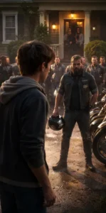 He removed his helmet and stepped forward, his presence commanding but calm. Liam’s neighbors shifted behind their windows, bracing for something violent, something dangerous.