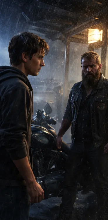 They walked together through the storm, Liam guiding while the stranger pushed the heavy black bike beside him. It felt surreal, like stepping into someone else’s life. When they reached Liam’s house, he lifted the garage door, and the man rolled the motorcycle inside, bringing with it the smell of oil, gasoline, and wet leather.
