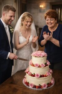 Then it happened—the moment that would define the day. 🎂 The wedding cake. A magnificent three-tiered creation, adorned with edible flowers, standing proudly at the center of the reception hall. Clara lingered near it, her eyes calculating. “Perhaps it’s not positioned well,” she suggested, with an almost imperceptible smirk. I warned her firmly not to touch it, yet she moved closer, hands hovering over the delicate layers.