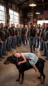 Behind her stood a large Doberman, tense and alert, its eyes scanning every man in the room as if measuring danger.