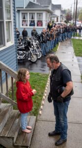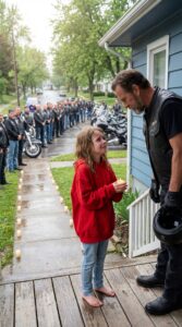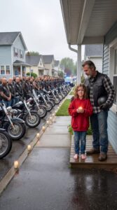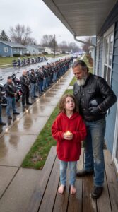 A Quiet Eight-Year-Old Girl Sat Alone in Her Small House After Losing Her Father While Dozens of Bikers Stood Silently in the Rain Outside, Making Neighbors Call the Police — Until She Stepped Out and Asked One Simple Question That Changed Everything