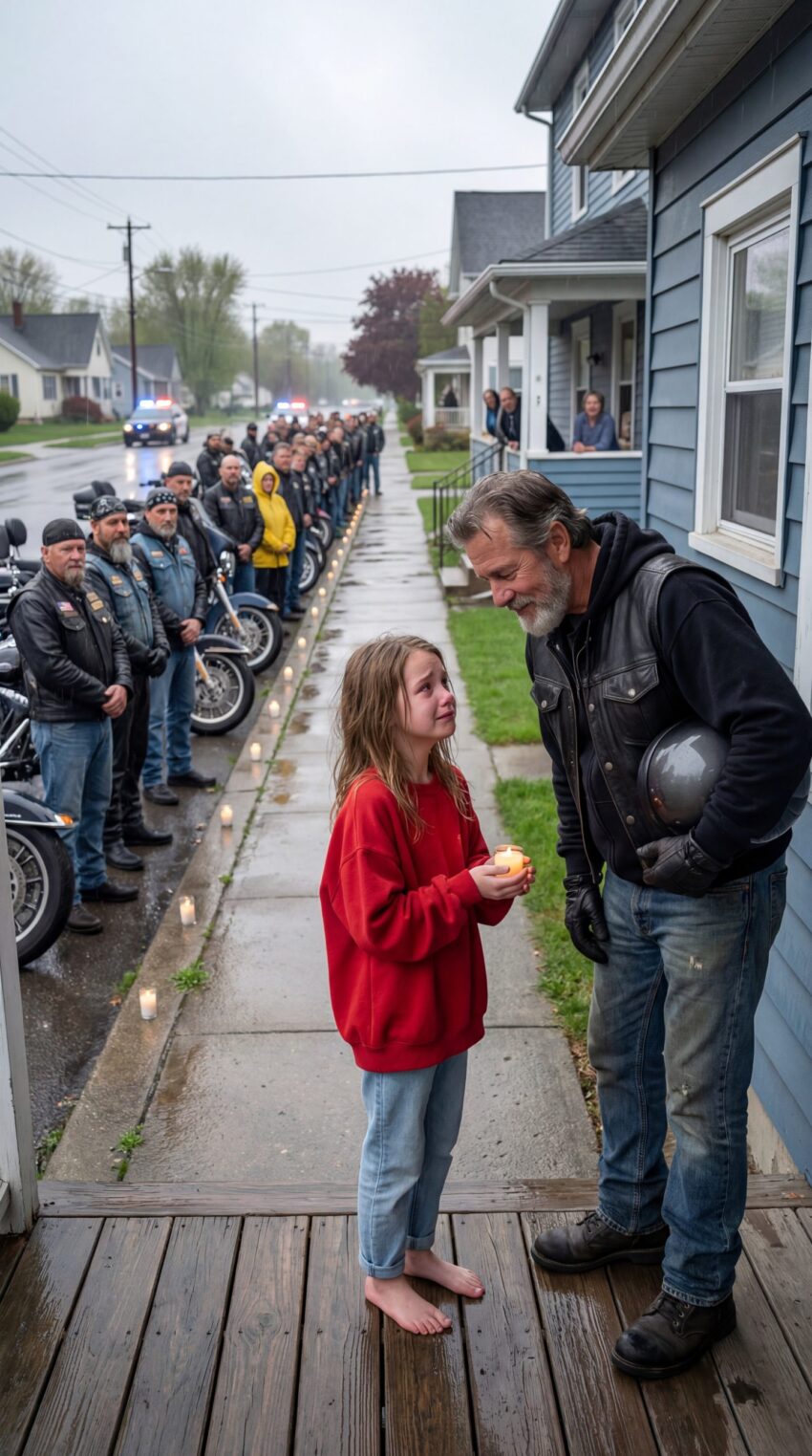 A Quiet Eight-Year-Old Girl Sat Alone in Her Small House After Losing Her Father While Dozens of Bikers Stood Silently in the Rain Outside, Making Neighbors Call the Police — Until She Stepped Out and Asked One Simple Question That Changed Everything