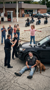 I had only stopped because I was running low on gas and needed caffeine before another hour on the road. That was all. I remember the smell of fuel in the cold air, the sound of tires crunching over gravel, and a police cruiser already parked near the side of the lot. At first, it looked like the kind of roadside stop people barely noticed anymore. A deputy stood near a broad-shouldered biker sitting on the curb. Another officer was talking into his radio. A few people glanced over, then went back to their business.