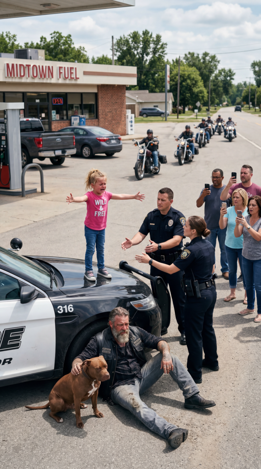 The girl spread her arms wide across the hood of the police car as though her tiny body could become a wall. Her face was pale, but her eyes were locked on the biker, not on the officers, not on the people staring at her, not on the phones that had already begun to rise.