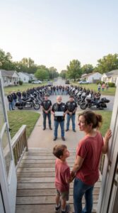 Black, chrome, and steel lined both sides of the road, stretching farther than she could see from her window. The riders stood beside them, quiet and still, their silhouettes sharp against the early morning light.