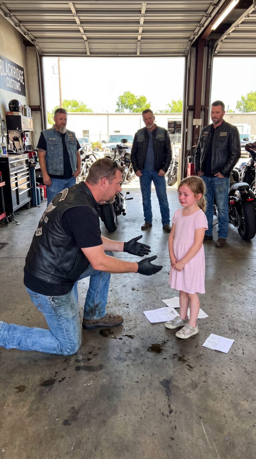 By the time someone truly noticed her, she had already been standing there for several minutes at the edge of the open service bay of Blackridge Customs, a biker garage on the west side of Cedar Hollow, Tennessee. It was the kind of place where the smell of gasoline, old leather, and warm metal usually covered everything else. Loud engines, rattling tools, and rough laughter filled most afternoons, making it easy for small things to disappear into the background.
