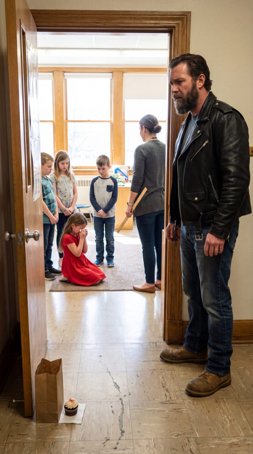A Biker Father Walked Into His Daughter’s Classroom Carrying a Small Cupcake, Expecting a Simple Surprise — Until He Saw His Seven-Year-Old Girl Struggling on the Floor While the Entire Class Watched in Silence