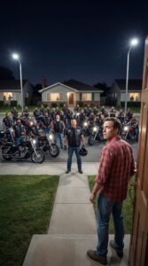 They poured into the street, headlights cutting through the dark, engines rumbling in a slow, controlled wave until they came to a stop directly in front of his house.