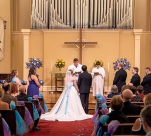The morning of February 14th dawned clear and bright. The church was adorned with pastel blooms, ribbons, and soft candlelight.