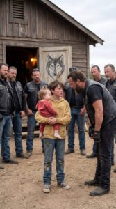 Caleb looked at the painted wolf on the clubhouse door. He had seen the riders around town before. Everyone had. Their motorcycles were loud, their leather cuts were heavy, and people stepped out of their way when they came down Main Street in a group. He did not know whether they were kind men or dangerous men. He only knew that the lights were on, the rain was getting colder, and Daisy had stopped talking twenty minutes ago.