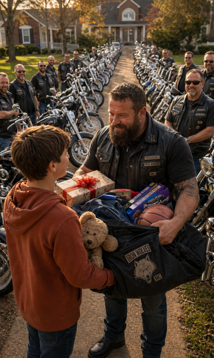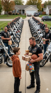 Ethan slowed There was something about the man that made him hesitate. Maybe it was the way he stood there without moving, or the worn leather vest that clung to his shoulders, marked with patches Ethan couldn’t understand. Most people would have crossed the street and kept going.