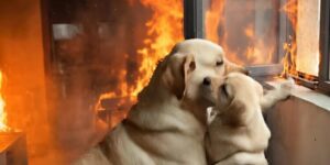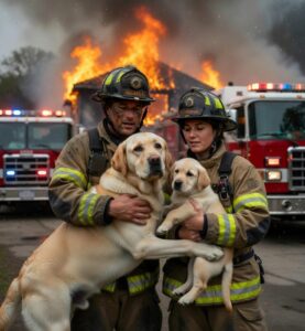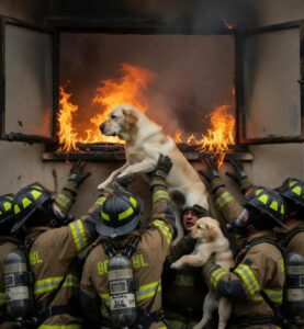And then I saw her. Luna. A golden retriever, standing at the window like a guardian, shielding a small puppy with her body. Her eyes, wide and fierce, yet filled with pleading, met mine. For a moment, the chaos around me—the smoke, the roar of flames, the fear—vanished. It was just her, poised, alert, desperate to protect. 💛