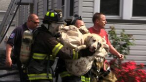 Tears stung beneath my mask as I held her, feeling the rapid pulse of her heart pressed against mine 💖. Outside, Mara, the neighbor, arrived, her face streaked with soot and tears. She scooped Luna into her arms, whispering frantic thanks, shaking as relief washed over her. Watching the two dogs pressed together, trembling but safe, was a moment etched permanently into memory.