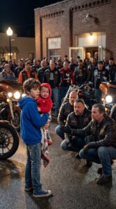 Motorcycles—row after row—stretching down the street. Riders in leather vests, engines low, presence impossible to ignore.