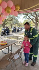 A group of veterans brought a child-sized helmet, painted pink with Lila’s name carefully written along the side.