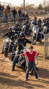 The motorcycles were getting closer now, dust trailing behind them like a storm rolling across the road. Colton reached the edge of the field, stepped directly into their path, and spread his arms wide.