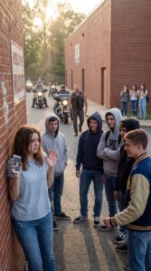 By the time the final bell rang at Briar County High, the parking lot was already glowing under the weak orange light of early evening. The football field sat quiet in the distance, the cheer banners along the fence barely moving in the wind, and the brick side wall of the gym cast a long shadow over the empty service lane behind it.