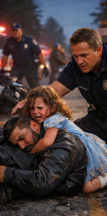 The man beneath her was enormous compared to her tiny frame. His leather jacket had torn open at the shoulder, soaked with blood. His helmet had rolled several feet away, cracked along one side like a broken shell. He lay perfectly still, chest barely rising, as if the world had simply forgotten to wake him up again.