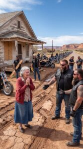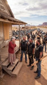The riders came in a long formation, their engines rumbling like distant thunder across the desert. Leather vests moved with the wind, and the late afternoon sunlight flashed against chrome handlebars.